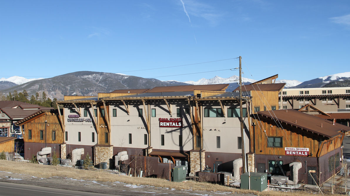 The Holiday Center re-skin is consistent with the adjacent Holiday Inn to create a cohesive environment that fits within the authentic mountain town character of Frisco. The exterior materials include stone, stucco, corrugated metal, and timber elements. Design features serve to break up the existing blank façades including low pitched roofs, flat trellises, stone and wood columns, and new fenestration patterns. Two added staircases on each end of the building echo the form of the Holiday Inn across the parking lot, as well as the large pitched roof and trusses over the center of the building. The added elevator provides handicapped access to all floor levels and mimics a large fireplace and chimney to create a warm central element that invites users to the building. The combination of these features and the use leads to a greatly improved aesthetic for the Holiday Center that is in harmony with the adjacent Holiday Inn and Frisco as a whole.